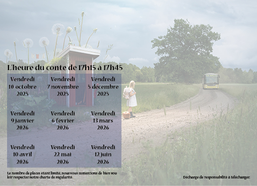 Si votre enfant est âgé d'au moins 4 ans au 30 septembre 2024, et inscrit à la médiathèque, il peut assister tout au long de l'année à la demi-heure du conte, un vendredi par mois de 17h15 à 17h45.